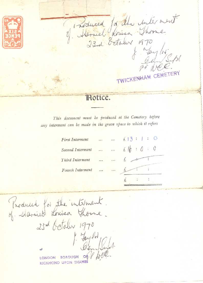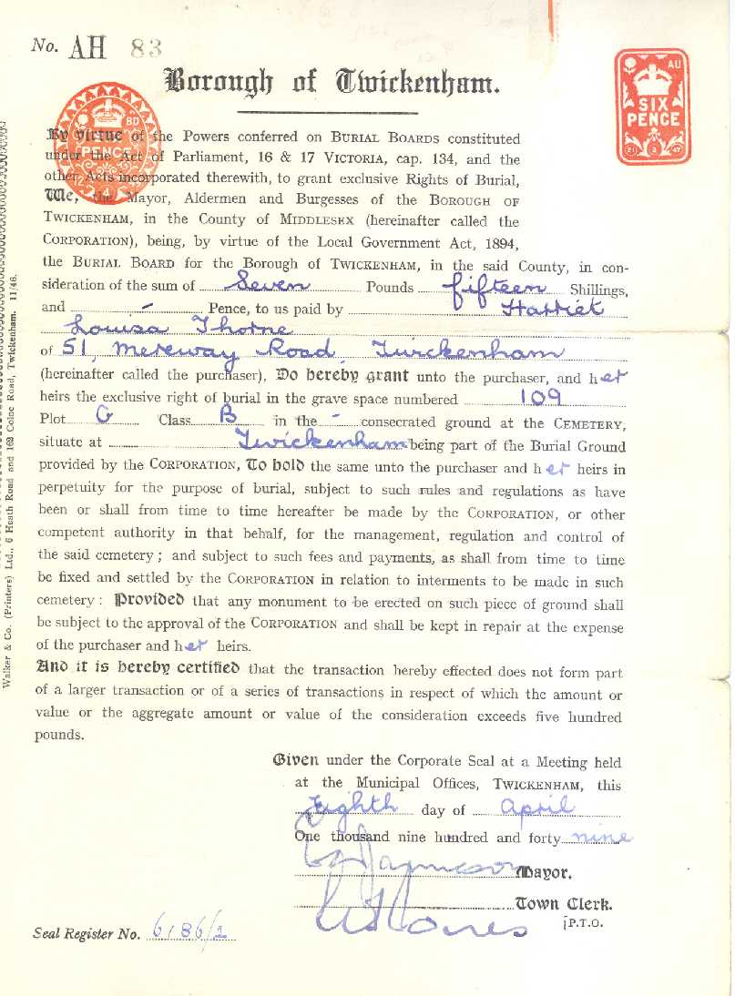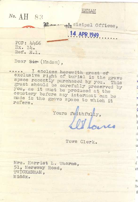 Purchase of Grave of Henry John and Harriet Louisa Thorne